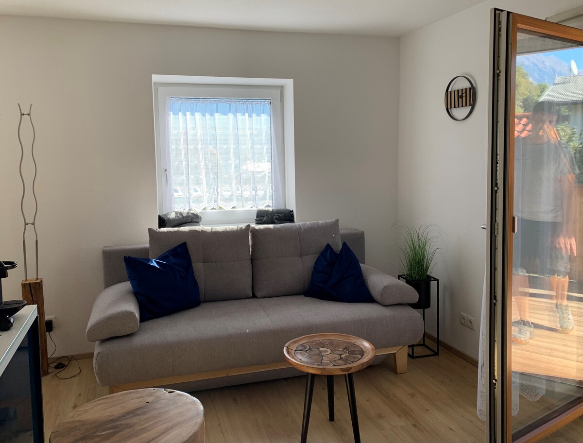 Situated on the outskirts of a Tyrolian mountain village this place offers you a wonderful-broad view. The apartment, lovingly combining tradition and modernity will let you calm down and recharge your batteries instantly. A closeby cable car enables you to all kinds of mountain sports in summer and winter. Yet- even those, who just "stay and relax" will feel at home. WIFI, TV, BT-boxes, parking space are available free of charge; for the Sauna we take a small feey. Kitchen is well equipped .