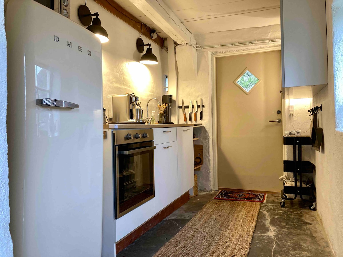 Cozy annex/backhouse with a private living area, sleeping space, and kitchenette – Please note: Bathroom, kitchen, and a small gym are located in a separate building just 10 meters away. Outdoor area with a fire pit and grill, peace and quiet. We live on the farm ourselves in case you need anything. An ideal spot for both a weekday escape and focused work. At the same time, close to the Higway, so you can get on quickly.