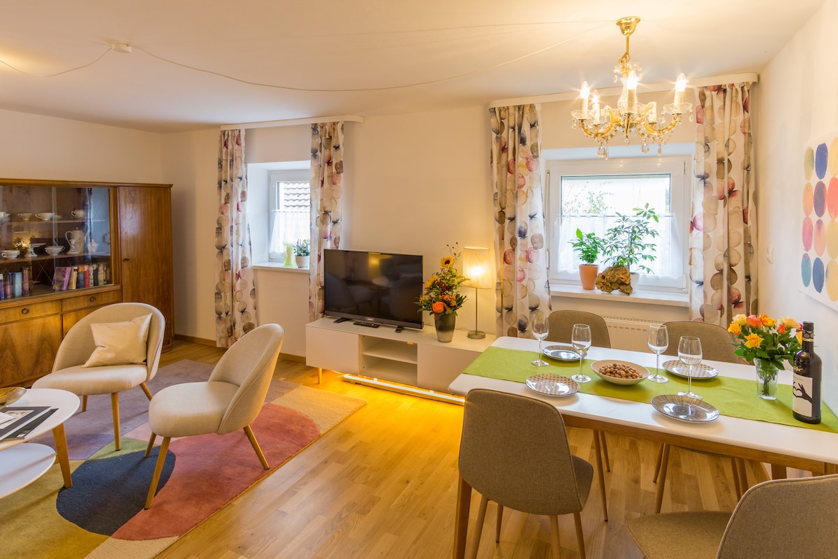 Enjoy peace & nature in our sunny country apartment for up to 4 guests. Bad Füssing & the highway are minutes away. ✅ Fully equipped private apartment (incl. Towels, bed linen) ✅ Free WiFi, coffee & tea ☕️ ✅ Smart TV with (Netflix, Prime & Co) ✅ Free parking & bike parking ✅ Free baby bed on request ✅ Pets allowed The apartment has everything you need & has 1 bedroom with double bed & a double bed in the living room. Looking forward to seeing you soon😊