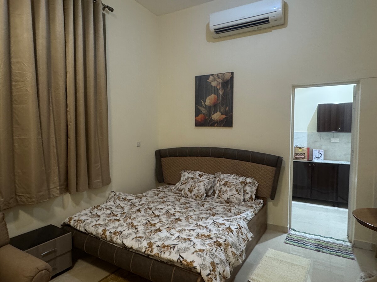 Stylish, spacious studio near Zayed Airport with decorative walls, a fully equipped kitchen, strong AC, WiFi, IPTV & big TV. Sleeps up to 4 with a double bed, bed loofa & floor mattress. Includes workspace, clean bathroom, shaded parking & a cozy rooftop corner for relaxing nights. Calm, clean, and respectful neighborhood. Close to supermarket & Makani Mall. Just 35 mins to major cultural spots. Perfect for comfort, work, and leisure.
