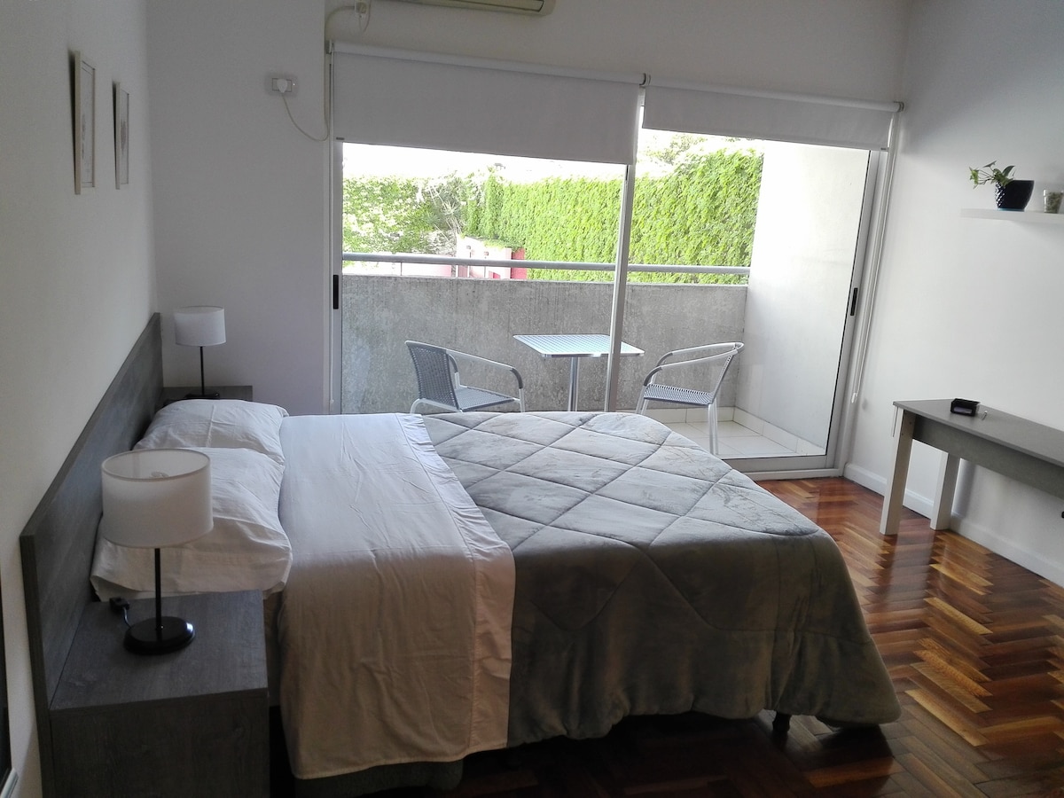 NEW QUEEN BED MATTRESSES Spacious and fully equipped studio apartment. Almagro, Italian Hospital Area / Centennial Park. With a large balcony with a view. - Queen bed and 2 singles or 4 singles (as needed). Very bright with: 100Mb Wi-Fi Internet 43" LED Smart TV - Cable, YouTube, Chromecast Towels and sheets Hot/cold climate control Full kitchen + amenities Coffee, tea, mate, etc. A large balcony