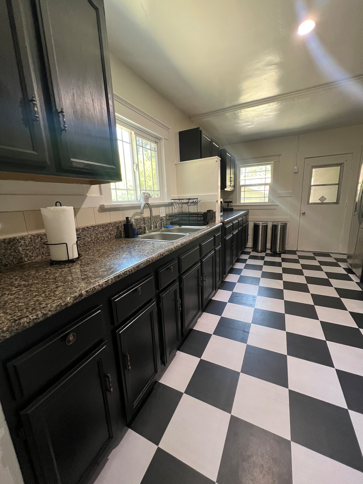 This 1-bedroom/1-bathroom house was built in the early 1940s, its decor is a nod to that era's timeless charm. Blackout drapes enhance the sleeping areas for a restful night's sleep. The beverage bar features ample cabinetry, an accent wall with backsplash, and unique open live edge shelves, crafted from the old avocado tree that once graced the patio. The patio has since been transformed with outdoor furniture, making it perfect for leisurely moments outdoors.