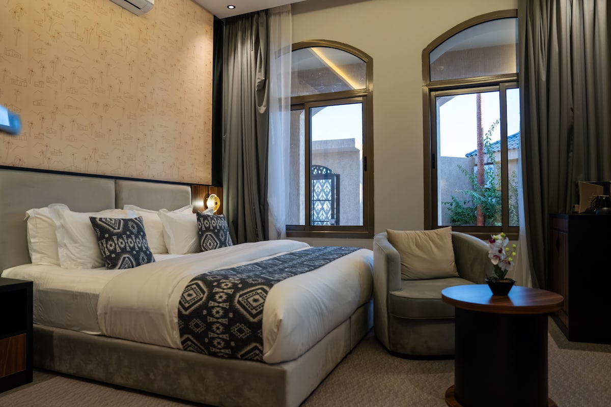 Enjoy staying in a luxurious and elegant room equipped with the latest amenities as well as having a distinguished swimming pool, gym, outdoor sessions in the garden and a coffee area. The location is in the center of Al Ula, 20 minutes from the airport and 10 minutes from the old town and is characterized by proximity to services