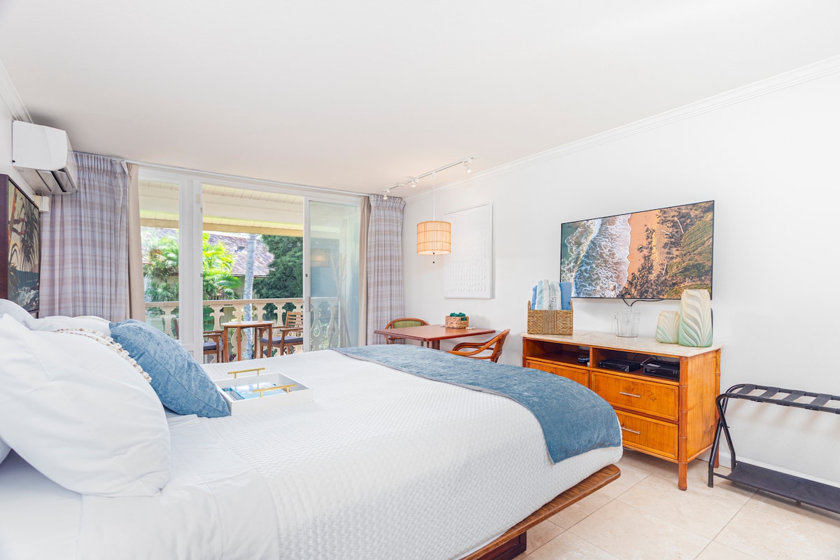 Garden View Lanai. Beachfront Resort. King Bed. AC