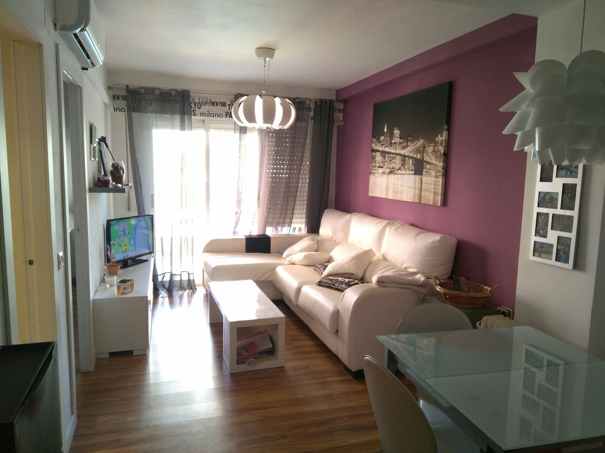 Acogedor apartamento luminoso, con piscina,plaza de parking propia a 250 m de la playa . Totalmente equipado ,2 habitaciocon una gran terraza, piscina comunitaria y parking. Muy bien situado, no se precisa coche para ir al centro o playas. Muy cerca del centro comercial, Mercadona. Barrio residencial de apartamentos muy tranquilo y cerca de todo. El aeropuerto se encuentra a 15 km, unos 15 minutos en vehiculo. Ideal para parejas, viaje d negocios, familias (con hijos) y grupos pequeños