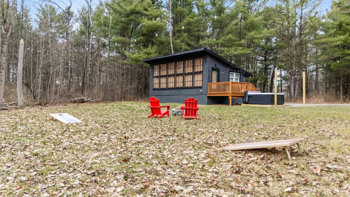 Escape to the Black Birch Cabin – a stylish, romantic hideaway designed for couples. Tucked away in the heart of the woods, this cozy cabin offers ultimate seclusion w/ a private hot tub, a crackling fire pit, and serene forest surroundings. Perfect for unwinding together, whether stargazing by the fire, playing board games, enjoying the peaceful ambiance, or simply reconnecting. The Black Birch cabin invites you to relax, recharge, and create unforgettable memories in a truly magical setting.