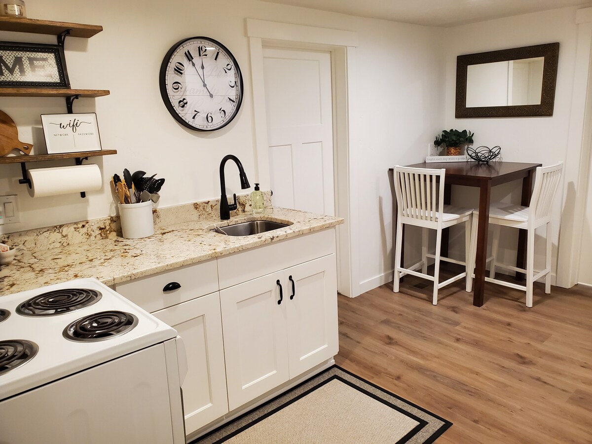 Stunning studio retreat, this suite attached to our house with separate entrance. This space offers luxury and comfort with an immaculate kitchen, private bath, and separate outdoor space with pergola. Our property is removed from the hustle and bustle of city life while just minutes away from downtown, Hot Springs, and short walk to our campground and the river. Come find your next adventure and feel at home. Wireless internet and tv! The kitchen does not have an oven or stove.