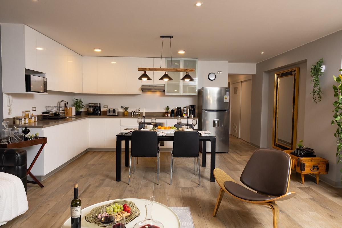 Spacious and elegant apartment in the heart of Barranco. Prime location: Within walking distance of the main tourist attractions of Barranco and Miraflores, the best restaurants, bars and art galleries. Master bedroom: King-size bed and large walk-in closet. Open and bright space: Living room and kitchenette with natural light. Private garage: subject to availability Common areas: Gym, meeting room and children's play area. Minimalist style.