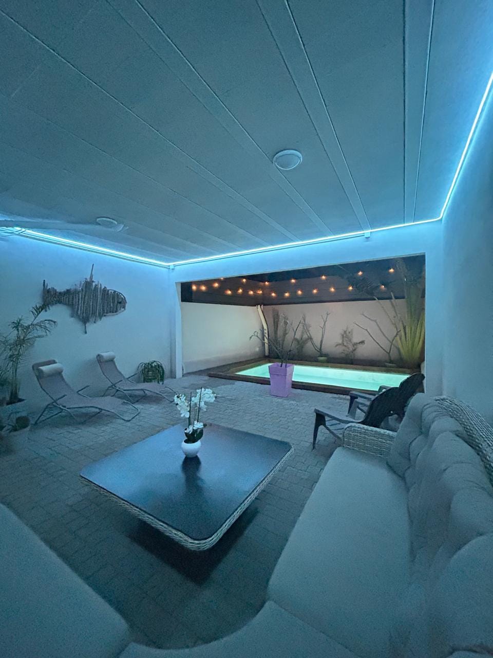 Spacious chic and bohemian studio with a tropical style adjoining our house has its own entrance. Air-conditioned, equipped with a 160 bed, bathroom with walk-in shower, equipped kitchen, private terrace and secure parking space for one car. Access to the natural stone pool in a peaceful green setting. Our sweet and sociable Labrador dog lives on site. Great for a relaxing stay for couples or solo.
