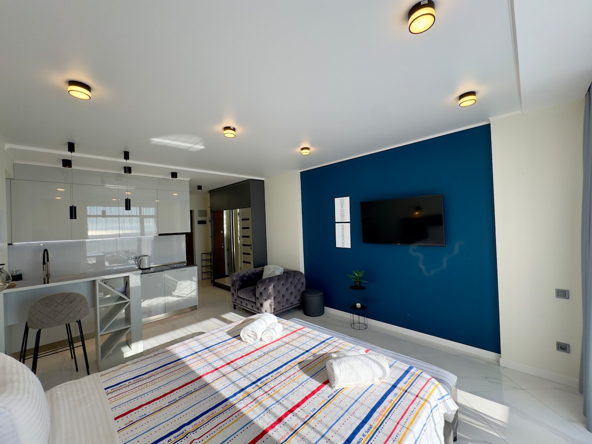 Sunny, bright, stylish, place filled up with different colors, with a great view to Black Sea, equipped with all facilities. Just few minutes to sea shore by feet. Shopping malls, dolphinarium, great choice of restaurants. Smart TV with cable.