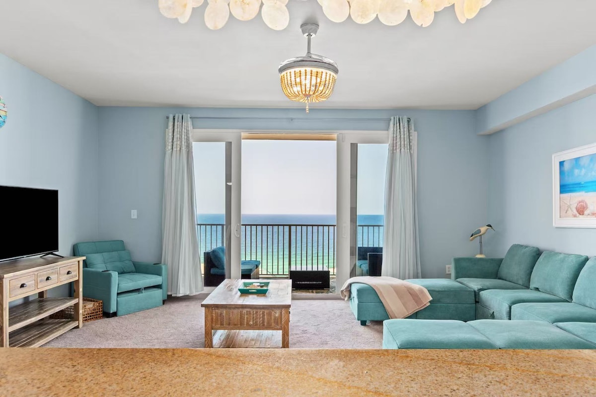 Beachfront condo on the 16th floor at Tidewater Beach Resort with 3 pools, hot tubs, onsite restaurant, Starbucks & beach rentals! Walk to Pier Park’s shops, dining, Ferris wheel & more. King master, Queen room, and bunk room—all with private baths. Sleeps 8 total with queen-size pullout couch in living room. 70” smart TV, fast WiFi, washer/dryer, fully stocked kitchen, Pack ’n Play, and board games. Small fee for parking pass (covers 2 vehicles & amenity wristbands). Family & couple friendly!