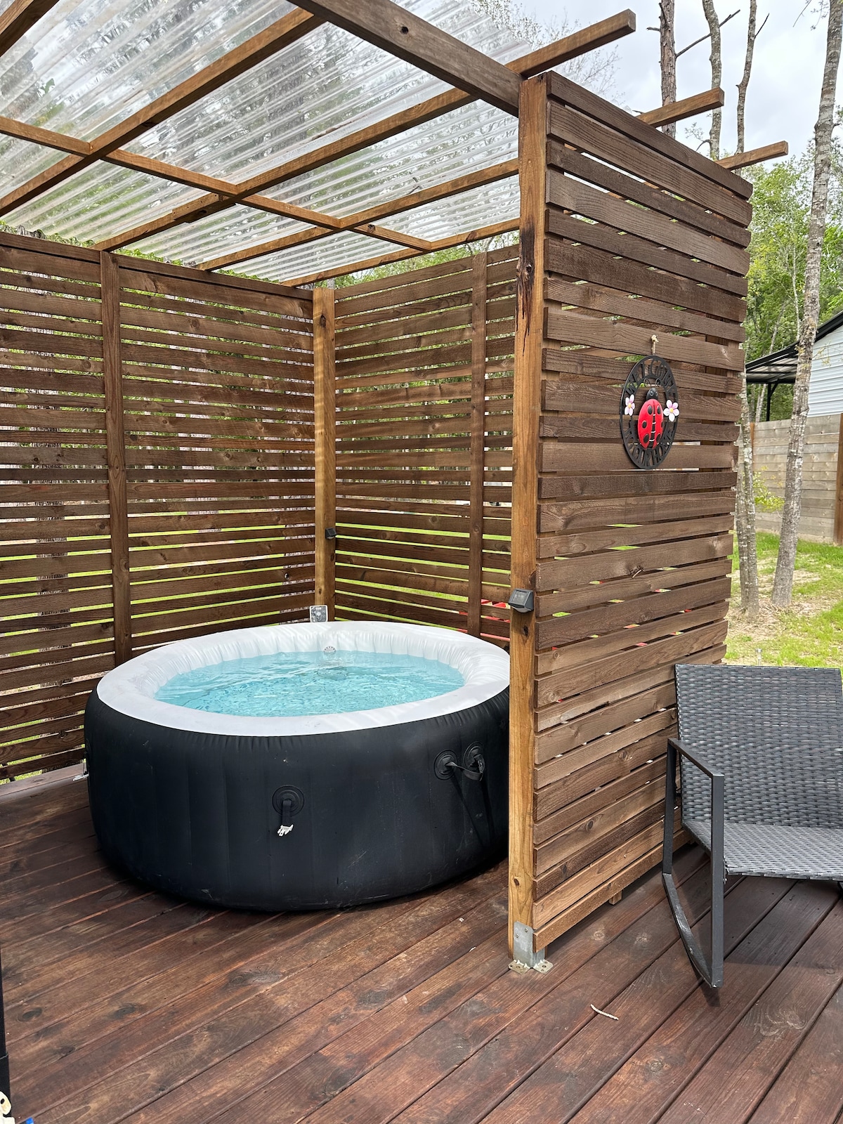 Welcome to “The Hunters Hut”, a private, cozy tiny space in the Pineywoods of Kountze, Texas, just 5 yards from the main house yet private. Not far from The Big Thicket. Relax on the porch with your favorite beverage, or unwind in your own private hot tub. Enjoy the shared dock at the pond, or try catch-and-release fishing (bring your own gear). Build your own private fire for the perfect outdoor evening—the adventure of camping with the comfort of glamping. Spacious for one, cuddly for two.