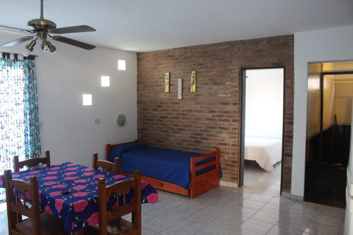Cozy studio-style cabin, ideal for two people. The cabin is located within a small family vacation complex. Built on mountain stone and surrounded by nature, a few meters from Av. Sarmiento and only 5 minutes from the center of Villa Carlos Paz. Includes: ✔ Bed linens and towels ✔ An equipped Kitchen ✔ Quiet environment for rest A perfect choice if you are looking for comfort, proximity to the city and the calm of a natural environment.
