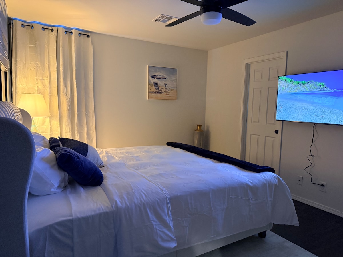 Enter from the backyard, into a shared laundry room with a hallway headed to your suite on your left. In that hall is a private restroom, right outside the door of your guest apartment suite. In the suite is a common room with a table and chairs for 2, coat/shoe rack, a queen bed and a pull out twin trundle. The large bedroom has a king bed, TV, closet, coffee/microwave cart and couch. The shared space, has a large fridge and a stainless steel sink for your use.