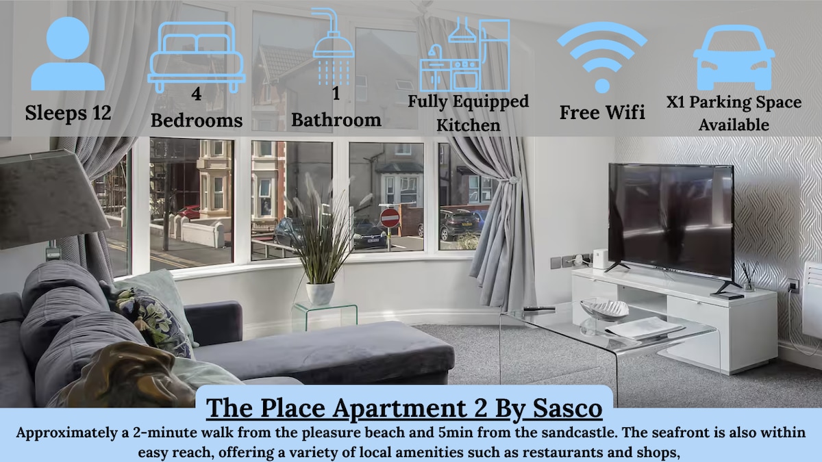 ✨ Spacious 4-Bedroom Apartment next to the Pleasure Beach - Sleeps 12✨ Approximately a 2-minute walk from the pleasure beach and 5min from the sandcastle. The seafront is also within easy reach, offering a variety of local amenities such as restaurants and shops, making it an ideal location for families, contractors, and anyone looking to book a stay.