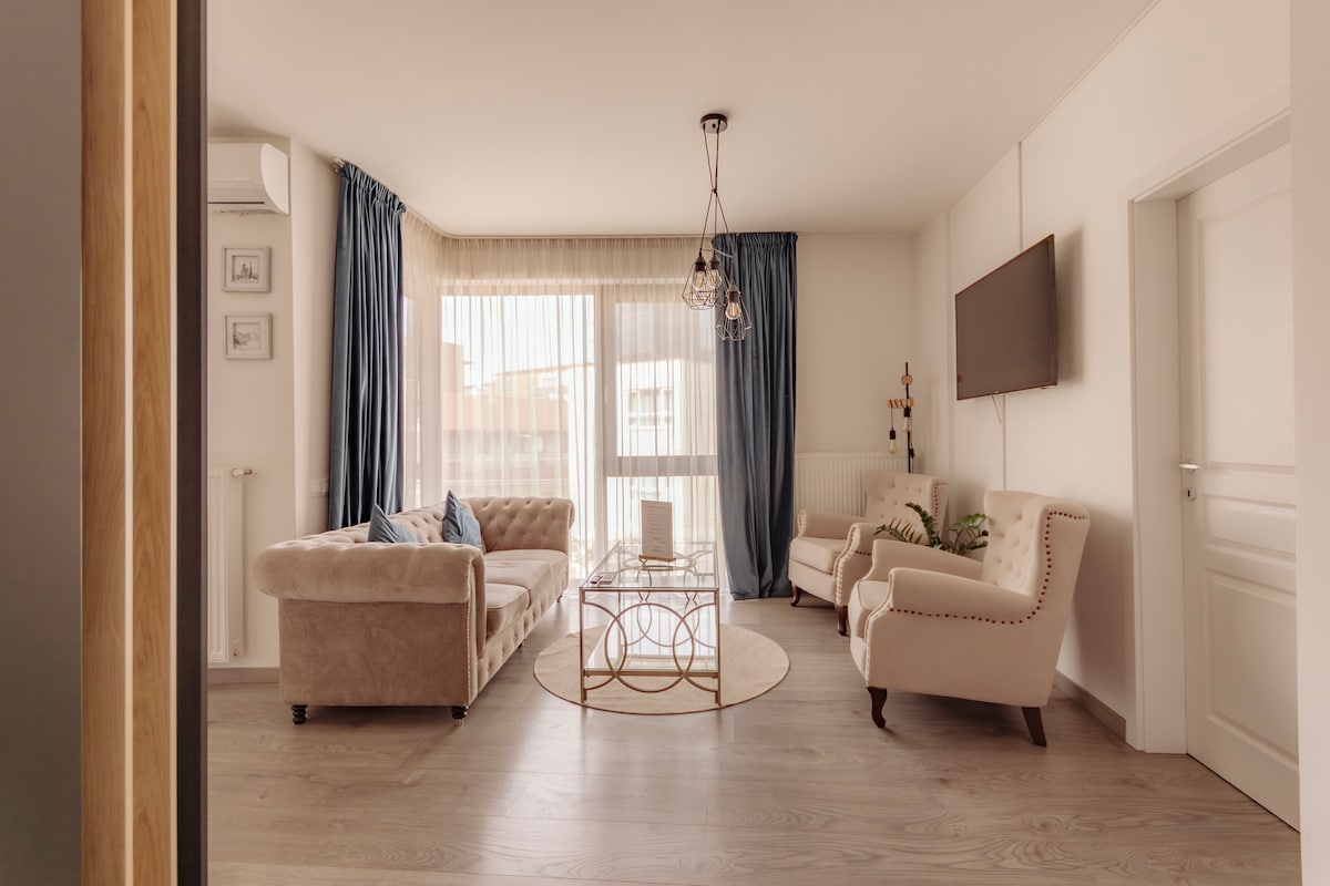 Welcome to our brand new one-bedroom apartment in Cluj Napoca, just 2 km from the city center! Perfect for solo travelers, couples, or small groups, this stylish space features a comfy double bed, an expandable couch, a fully equipped kitchen, Smart TV with cable& Netflix, and a beautifully furnished bathroom. Come enjoy a cup of coffee on the house while you take in the peaceful surroundings from the terrace. Private parking and self-check-in are included. We look forward to hosting you!