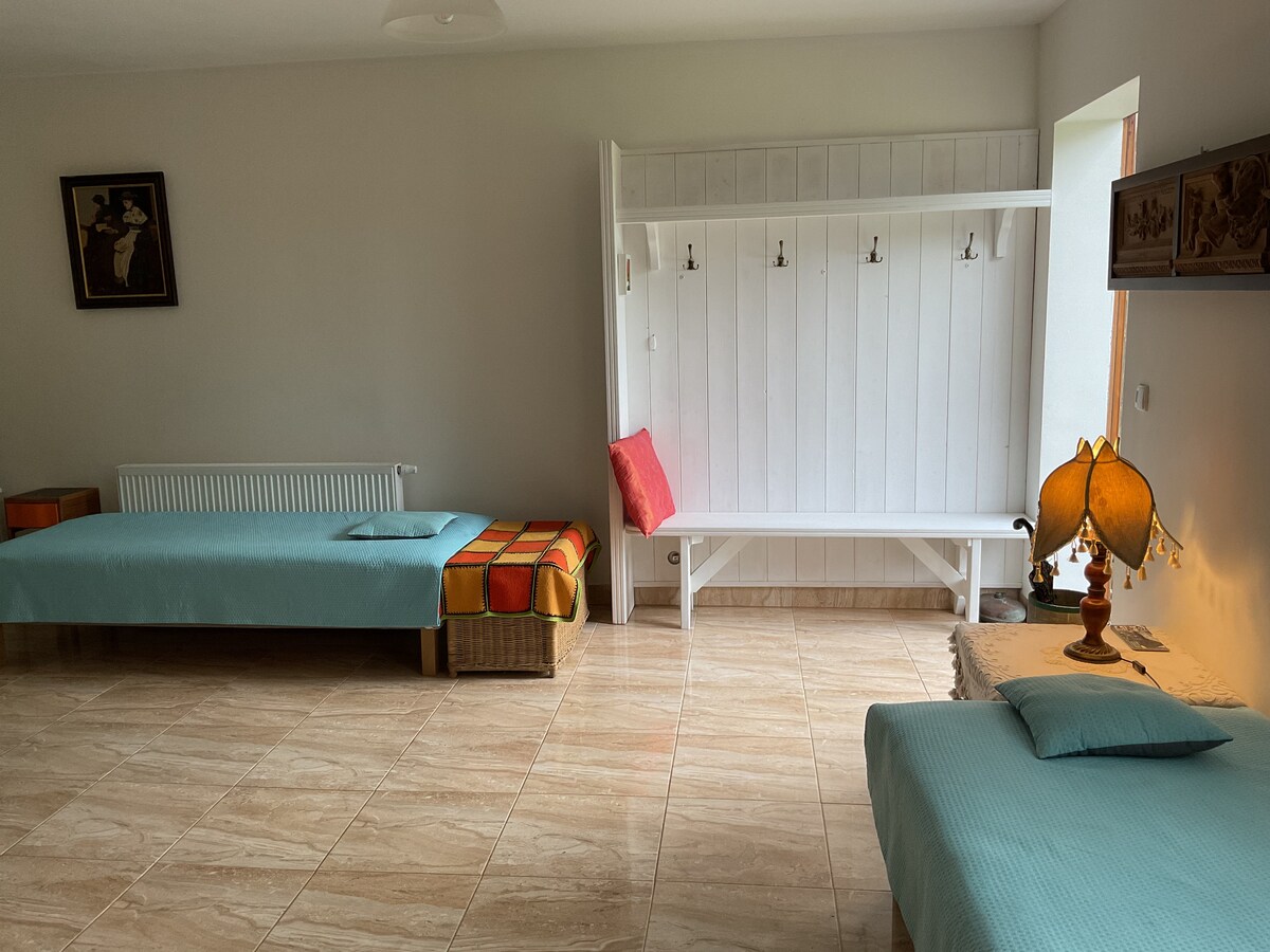 Zapraszamy do całorocznego domku z tarasem, miejscem na ognisko oraz grillem. Ogród jest duży, wspólny z gospodarzami. Nasze koty, psy i owce chodzą wolno i zwykle pierwsze pędzą witać gości :) Posesja otwarta na łąkę i las, którym biegnie zielony szlak. Niezakłócone miejskimi światłami niebo nocą pełne jest gwiazd, a z okolicznych lasów słychać odgłosy dzikich zwierząt.