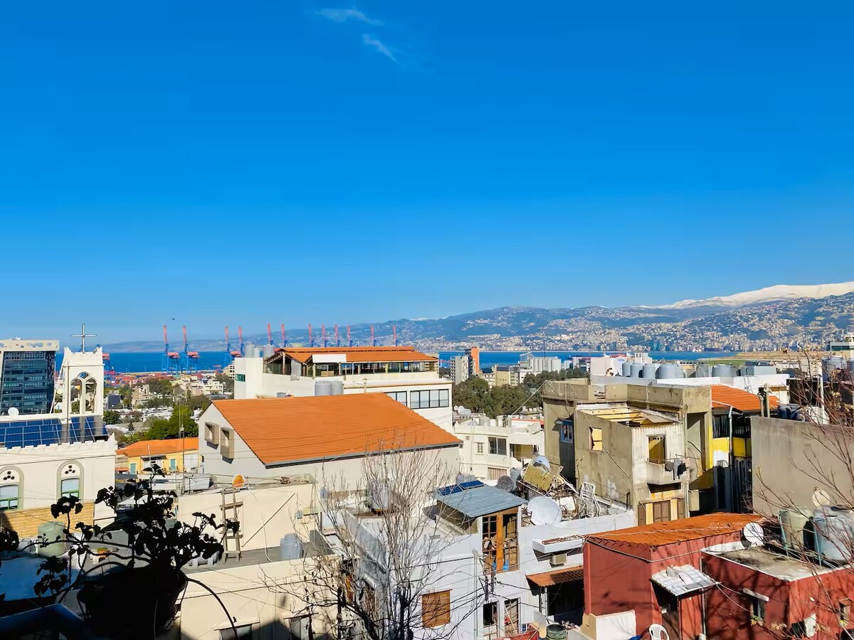 Centrally located top floor tiny apartment. 24h generator electricity. AC and hot water. Has a very nice L shaped balcony with a view of the mountains, the sea port and the Beirut skyline. Elevator is available 18 hours a day, in addition to government electricity hours which could make it 24h a day! The AC has a consumption counter and I usually charge extra for anything that is above normal consumption (4.5Kw/day), as some guests tend to go crazy with the AC use.