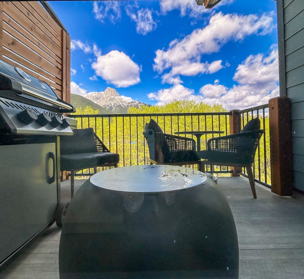 TOP FLOOR & PRIVATE. Fully disinfected prior to your stay. Exceptionally clean, see reviews. New linens & smallwares Large deck with BBQ & seating area with stunning views of the Rocky Mountains. Outdoor Chaise lounge x2 Tastefully decorated. Fully equipped kitchen. Bedroom has luxurious King Bed. Living room has sofa & large ottoman. Bathroom has Soaker Tub. TV/Wifi. In-suite Washer/Dryer Shared Pool, Hot Tub, Gym, Secure Parkade. Easy walk to town. Convenience store is nearby (5 min walk)