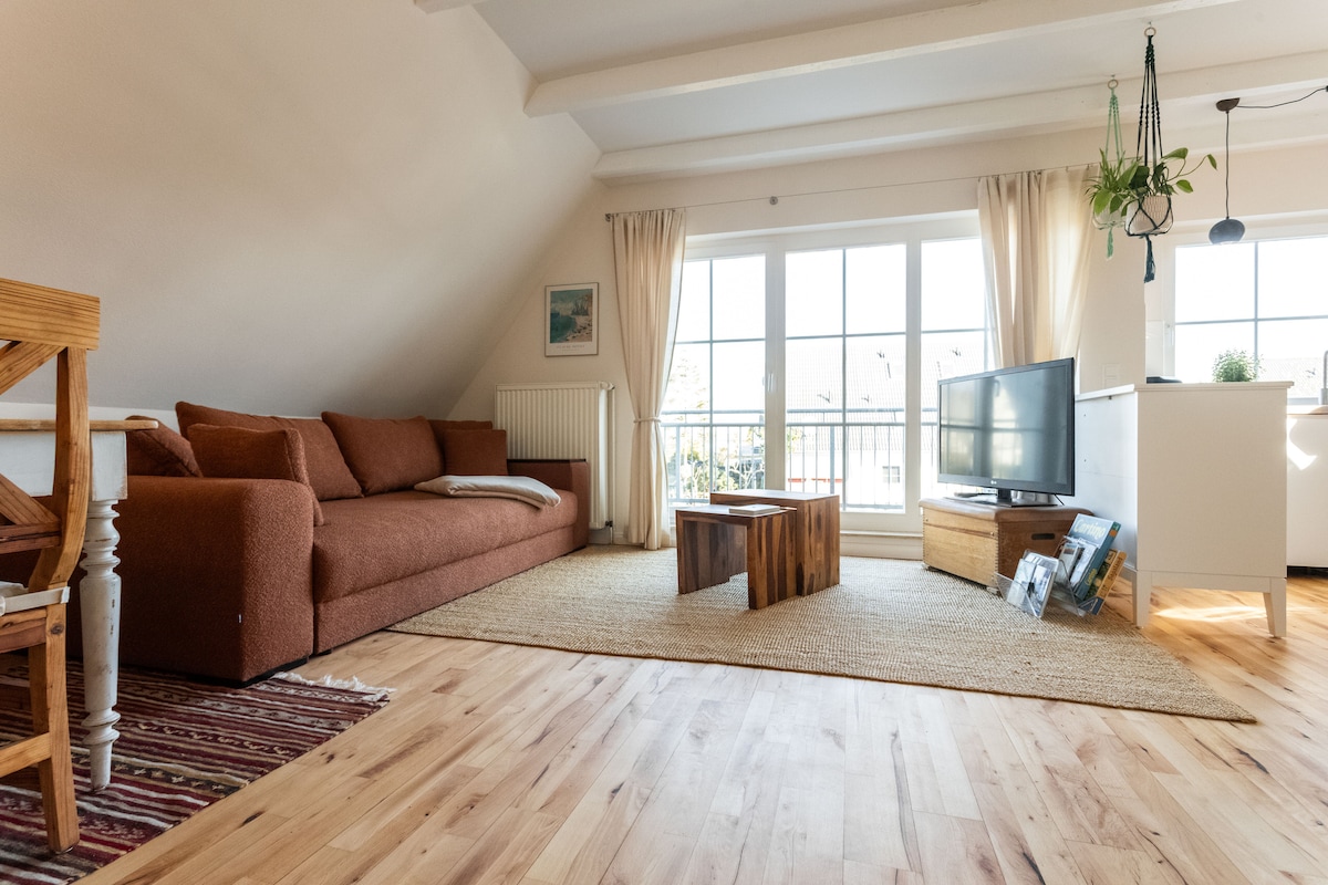 The apartment is located in a lovingly modernized house in the idyllic village of Vieregge – a real insider tip for those who want to enjoy peace and nature away from the tourist crowds. The 34 m² apartment is wonderfully flooded with light through large windows and skylights and impresses with tasteful, clear furnishings and its own terrace. Facilities include a separate bedroom, a modern bathroom and a spacious living and dining area with an open kitchenette.