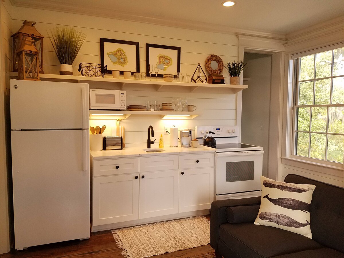 We love the laidback neighborhood, charming historic architecture, and the 5-block walk to the breezy waterfront along Bay Street. The cozy cottage is one bedroom, one bath, and a lovely living space on a postage stamp lot. The built-in breakfast nook is our favorite spot. Other features are the chic furnishings, 11’ ceilings, tall casement windows, and little front porch. Off-street private parking for one car and smart tv/wifi. The 400 SF cottage is named after the architect's daughter.