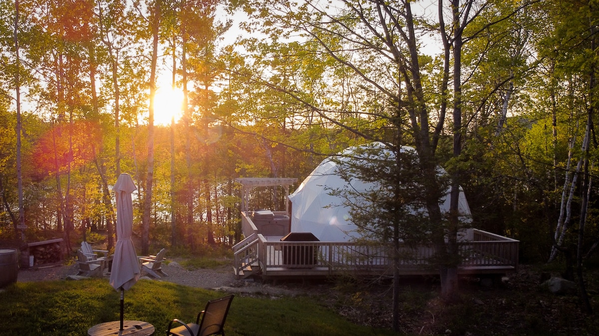 Escape into nature with a stay in one of our luxury domes. Fully equipped kitchen with cookware, dishes, utensils, etc, as well as coffee and tea. Private bathroom with a toilet, shower, and essential toiletries. Two queen size beds with a loft space. The outdoor area includes a BBQ, private electric hot tub, and patio furniture. Kayaks are available during the summer months, as well as a communal fire pit. **Please note, there is a short walk down a hill to get to the dome**