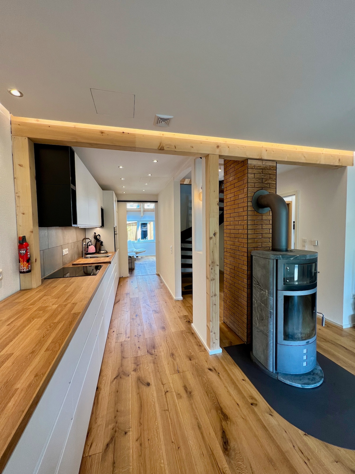 Cozy cottage approx. 100 m² of living space with garage, pergola and garden, well suited for families On the ground floor there is a kitchen-living room with a wood-burning stove and pantry, a living room with an adjoining master bedroom with a piano, cable TV and sleeping facilities, a hallway and a toilet. On the 2nd floor, there are 3 rooms with 5 beds, a hallway, bathroom and toilet. Mains switch. Additional sleeping space in an attic room. The historic center of the Hermann Hesse town of Calw can be reached on foot in 5-10 minutes.