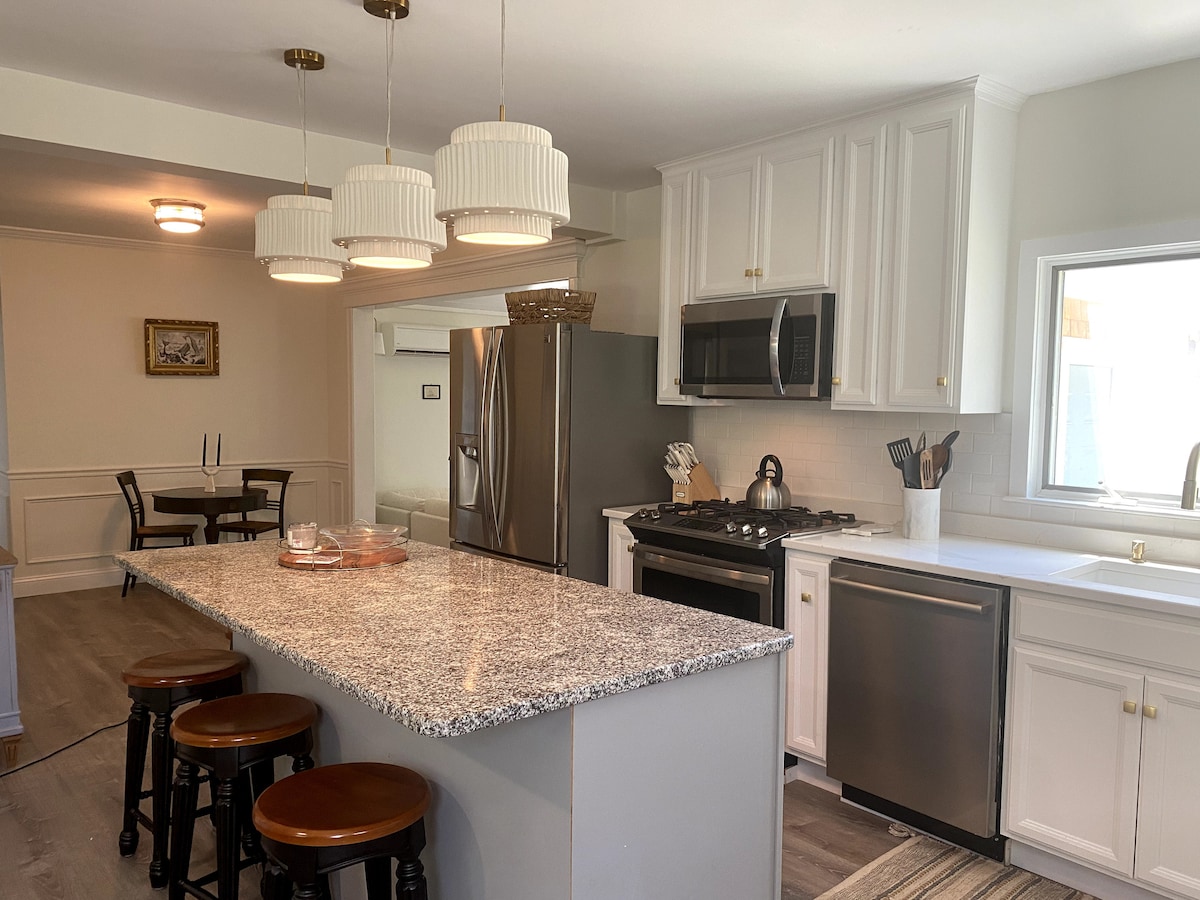 A quintessential island vacation spot in this charming Vineyard Haven bungalow -- formerly owned by a legendary local sea captain. From the house it's about a half-mile walk to the town beach and downtown, 1-mile walk / short bike ride to Tashmoo beach. Lounge on the sunny peaceful porch, grill out back, and enjoy the newly-renovated open-floorplan kitchen, living room, and cozy bedrooms. Free parking (two spots).