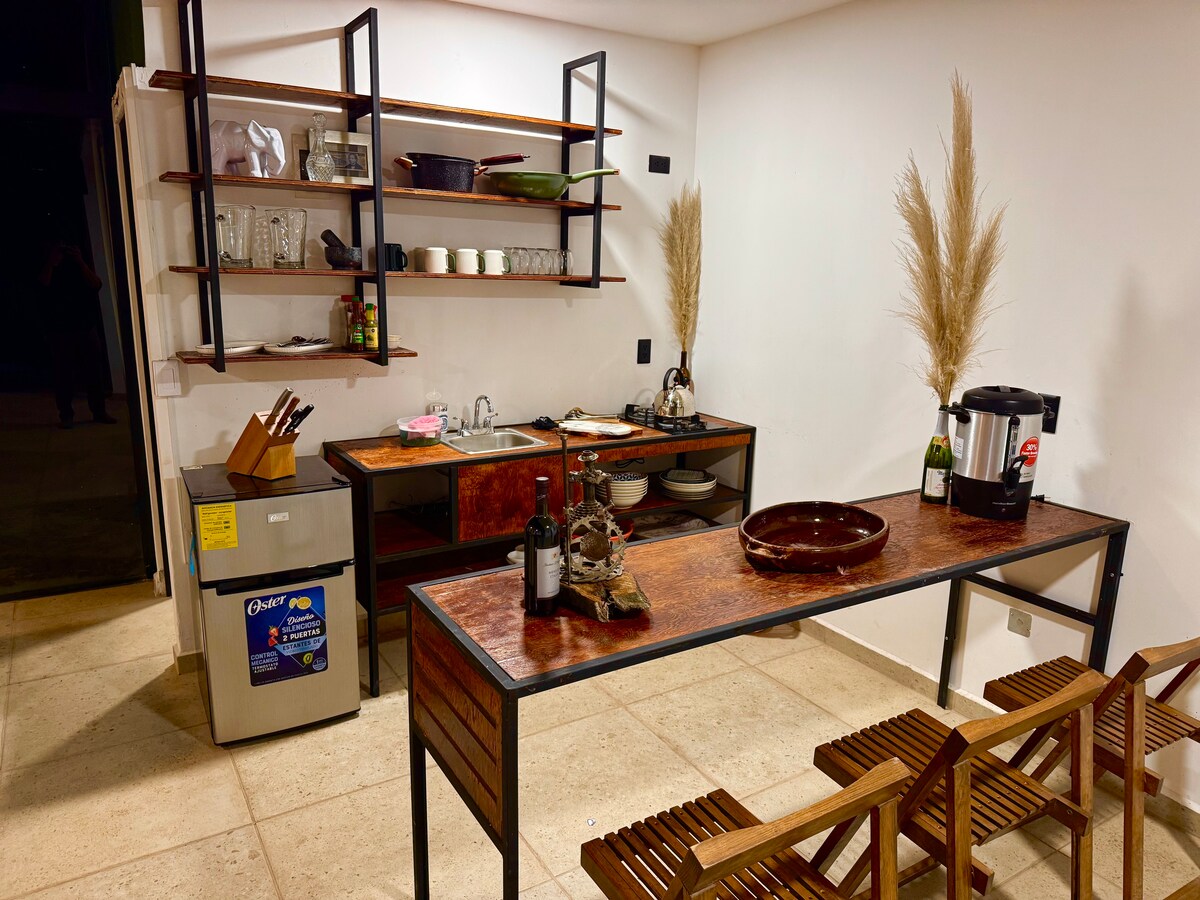 Immerse yourself in a natural environment, a cabin with a minimalist-industrial design, an intimate and cozy space, essential amenities for a comfortable stay. Our botanical space is enriched with surreal and pre-Hispanic sculptures, outdoor dining spaces, a koi pond for moments of calm and relaxation, fireplaces and a barbecue grill for an afternoon of exceptional coexistence.
