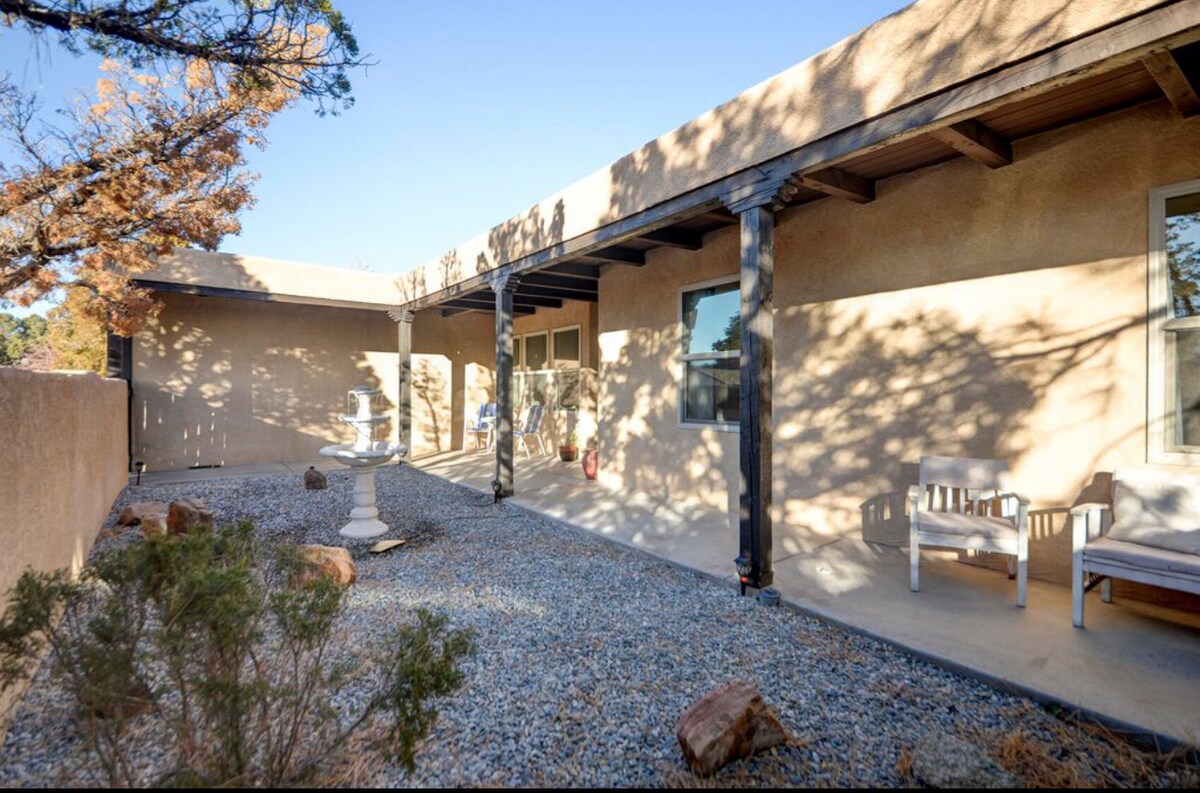 Welcome to your peaceful safe retreat in the best foothill neighborhood—just 7 min from I-40, 12 from I-25. Tucked away on a quiet cul-de-sac, this cozy in-law suite was created for loved ones. Enjoy your private entry, your own patio with outdoor dining and seating, and off-street parking. Feel at home as you relax in the serene 2/3-acre garden with a tranquil pond, tea hut, and deer visitors. Trails and grocery are a short walk away. Sip organic coffee, rest in all-white linens, and simply be.