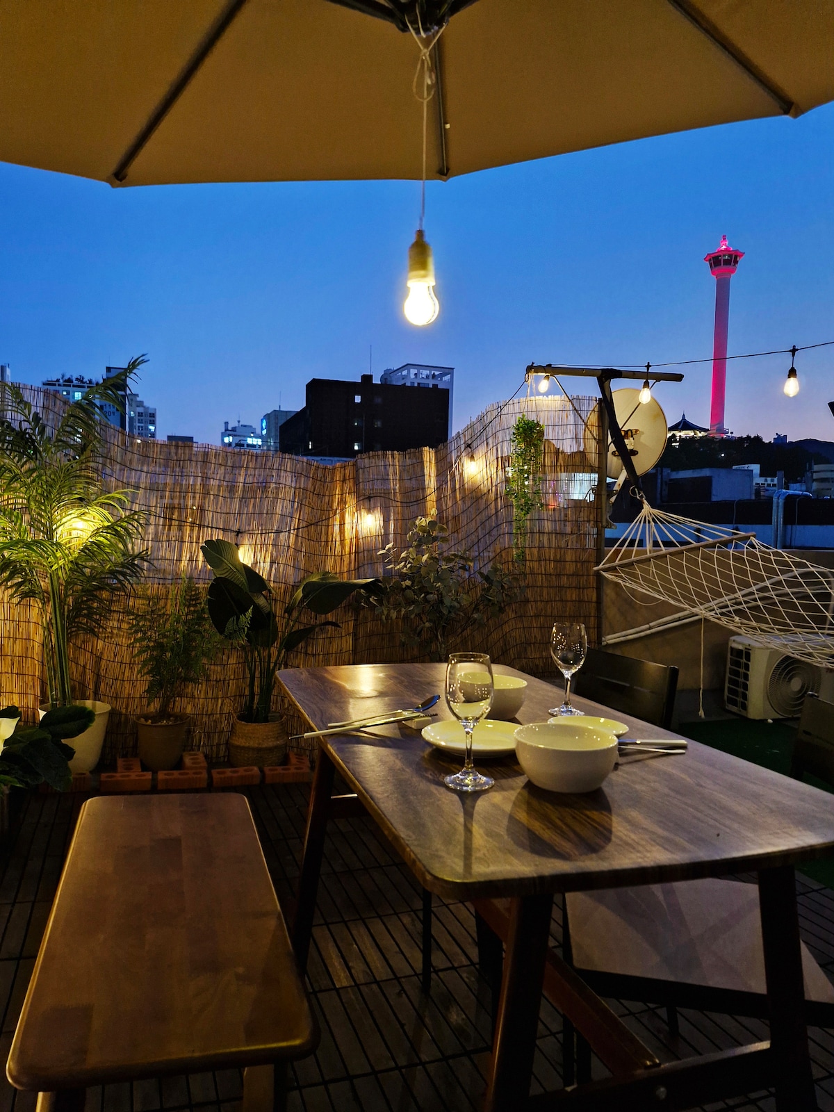 Rooftop hot water jacuzzi & Korean barbecue. Healing spot. Pretty accommodation.Night view. Couple. Jagalchi. Gamcheon Village. Nampo. Gangtong Market.