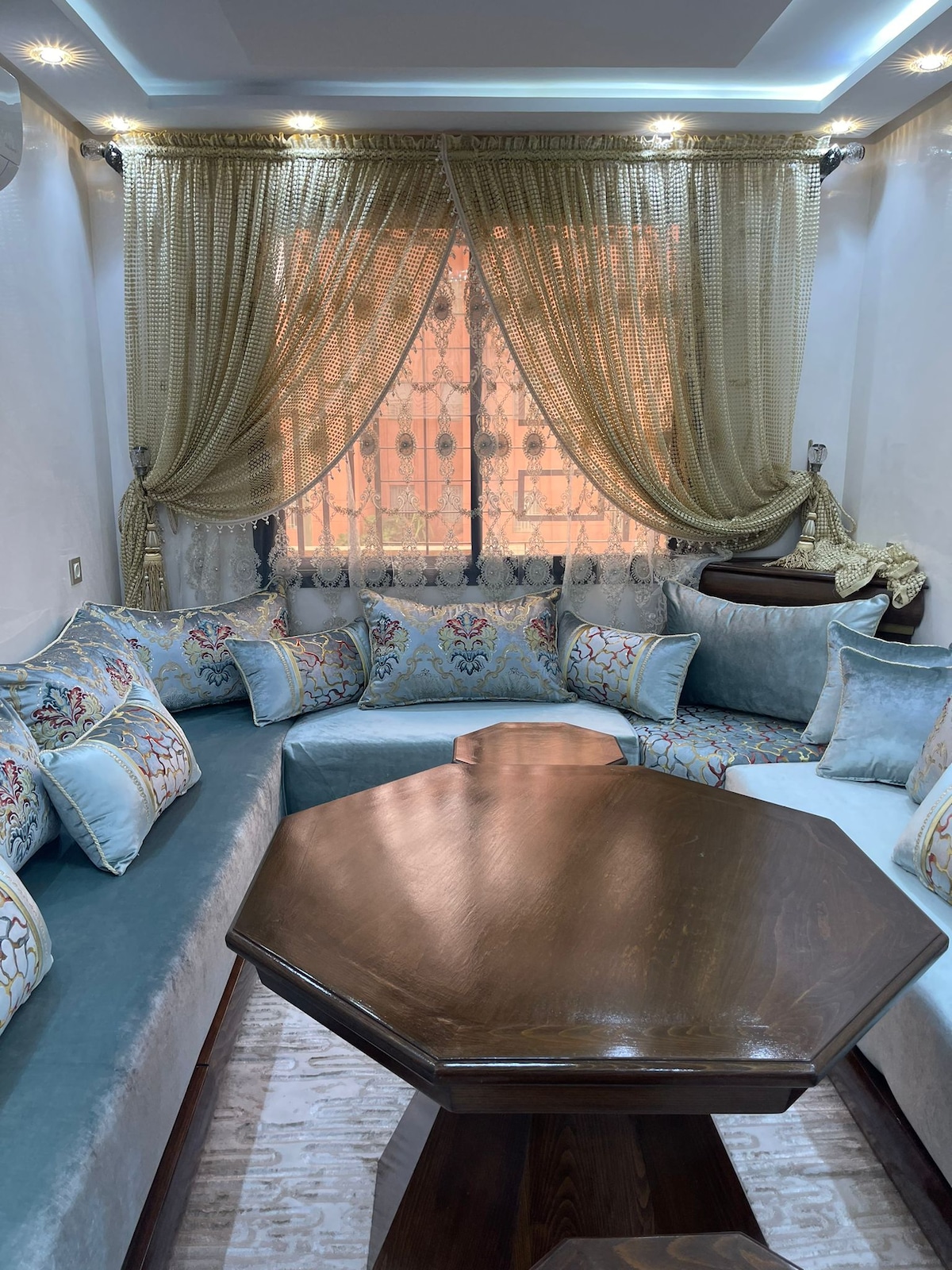 We proudly present this beautiful new built modern 2 bedroom apartment on the first floor in a 2 apartment building/house with access to the top floor open air terrace. The apartment has fully furnished modern traditional Moroccan living room with Smart TV. 2 bedrooms, modern fully equipped Kitchen, fully equipped modern bathroom and good size balcony. The main Marrakech old city is 25 min by taxi(20KM). Local taxi estimated cost is 8DH Per person from Sidi Youssef Bin Ali)