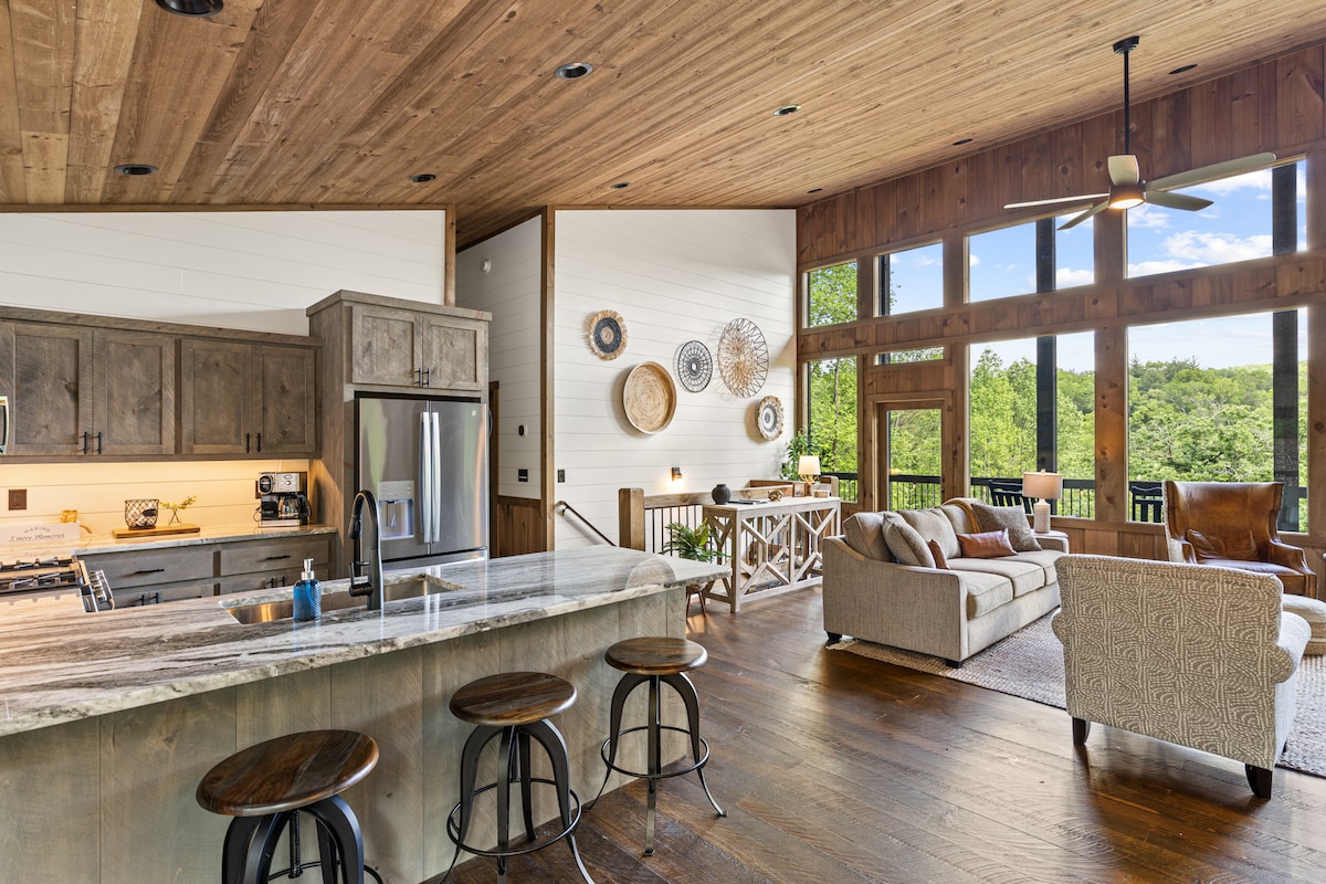 Spacious 2-bedroom ridge cabin with sweeping mountain views. Designed for two couples or a small group, with two private California King bedrooms (each with its own private bathroom) and shared living space that makes gathering easy. Enjoy a private hot tub, indoor fireplace, full kitchen, and a deck built for sunset evenings. Adventure nearby, privacy when you return. Designed for gathering without sacrificing comfort.