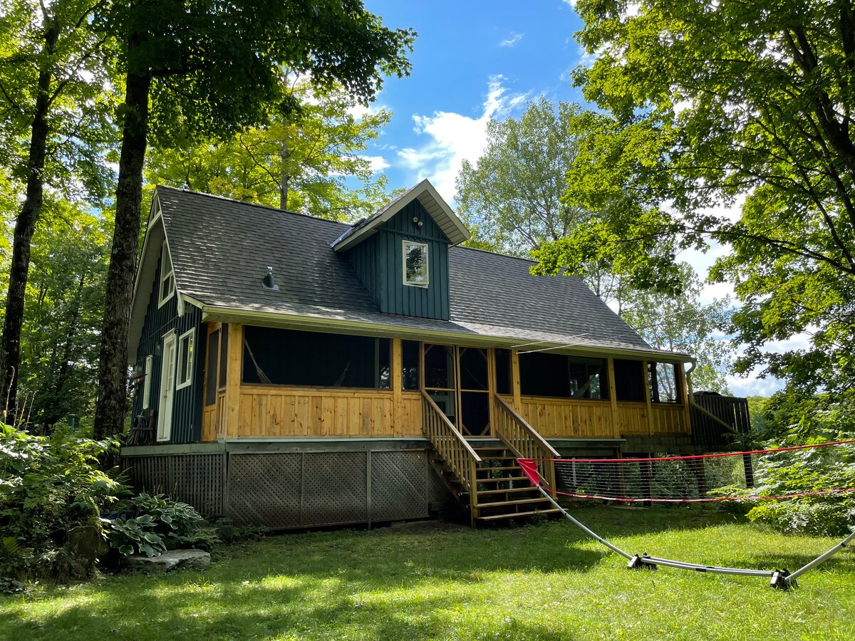 Welcome to a relaxingly private, 4-season, 2 bedroom, 2 washroom, chalet-style cottage with wood-fired sauna and bunkie. Only 2 min. drive from the Hamlet of Coe Hill, our cottage features wrap-around deck facing the lake, screened-in porch with hammocks, bright & fresh wood & stone interior with everything you might need for a getaway from the city. Also, includes high-speed WIFI internet, for streaming or working remotely, 3 outdoor fire pits and a badminton/bocce area.