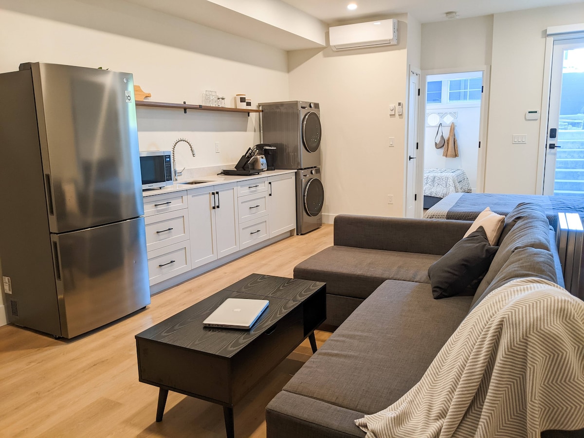 Guests love our top 5% home: sparkling clean, beautifully designed, and incredibly comfortable. Boutique-style suite with high ceilings, a luxurious king bed, and comfort better than a hotel stay. Enjoy a sunny living room, in-suite laundry, 1G Wi-Fi, 52" smart TV with Netflix, free coffee & tea, private entry, and free parking. Thermostat heating and naturally cool in summer. Walk to transit, parks, and trails; a short drive to shopping. Perfect for couples, families, solo, or business stays.