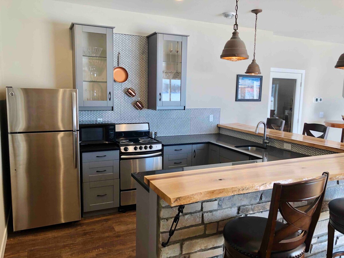 We love living on the lake and are so happy we get to share it! The guest suite is the walk-out lower level of our home built on Little Cormorant Lake outside of DL. 1 bedroom with queen bed and very large bonus room that sleep up to 7 on the bunk beds. Private bathroom, living room with fireplace and bar (complete with fridge, sink and dishwasher). Brand new kitchen with quartz countertops and custom bar top. Wake up to gorgeous views of the lake and get ready for a fun and relaxing time!