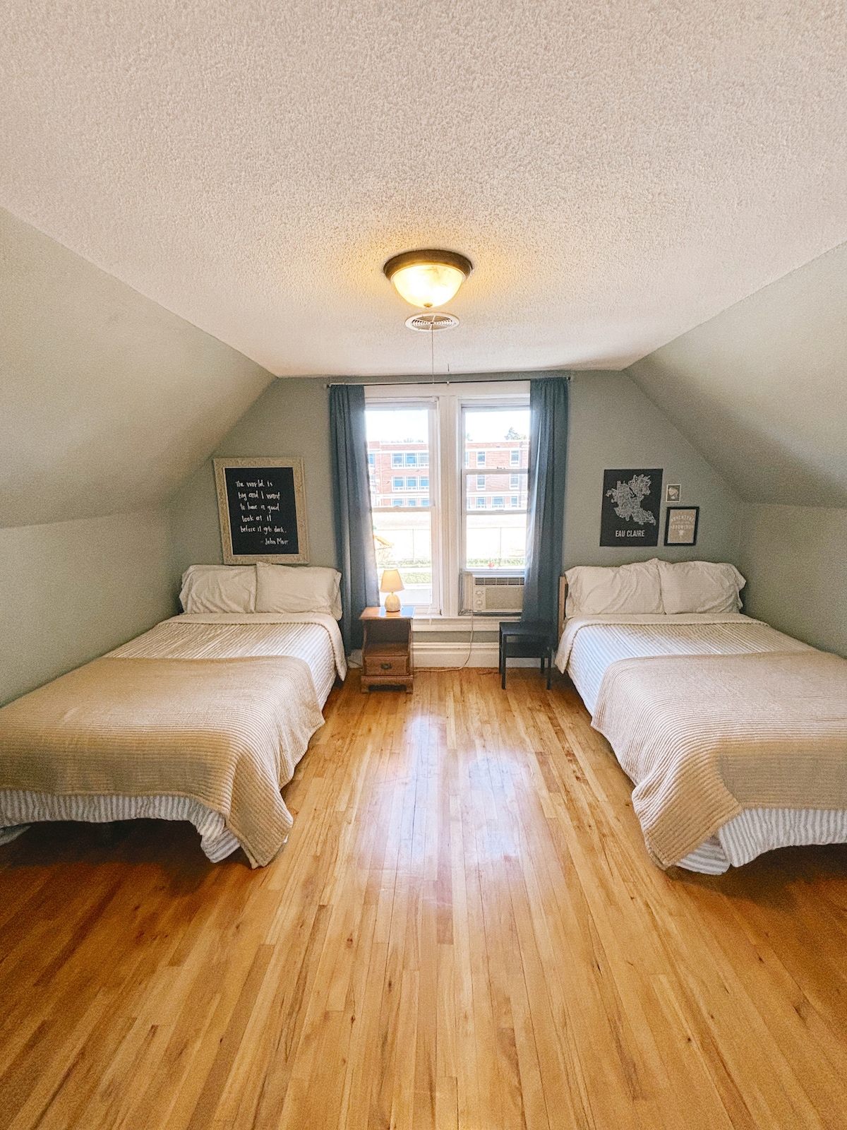 This two-bedroom, one-bath *second story* loft style living space is perfect for your stay in Eau Claire. Boasting a washer and dryer, full kitchen, keyless entry, many windows and comfortable furniture – you will feel right at home in this cozy and functional space. Nestled in a quiet neighborhood minutes away from downtown and UW-Eau Claire. This area offers many options for dining, the arts and shopping. Everything you could want or need is a short drive, bike ride or walk away.