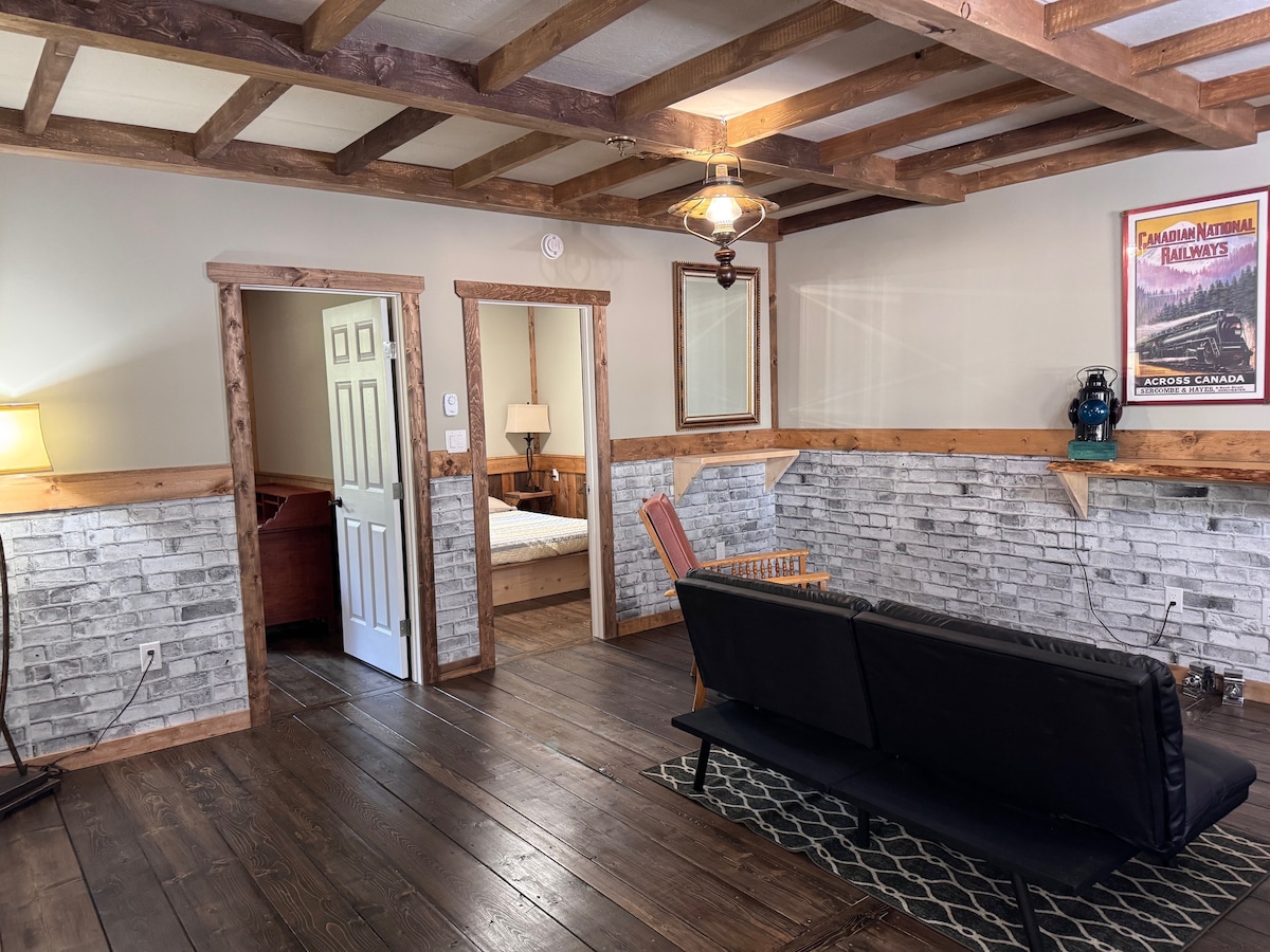 Enjoy breathtaking lake sunsets in this serene location at Pier 55 Campground. This lower Suite has one bedroom with extra beds in the main area with a peaceful cabin feel. Includes a Kitchen and Bathroom, BBQ & fire pit. In the summer, enjoy fishing with boat rentals, and free use of our kayaks, pedal boat & SUPs. In the winter, you can snowmobile and ice fish right outside your door! Close to the Ski Timber Ridge hill or many trails for hiking, snowshoeing or cross country skiing.