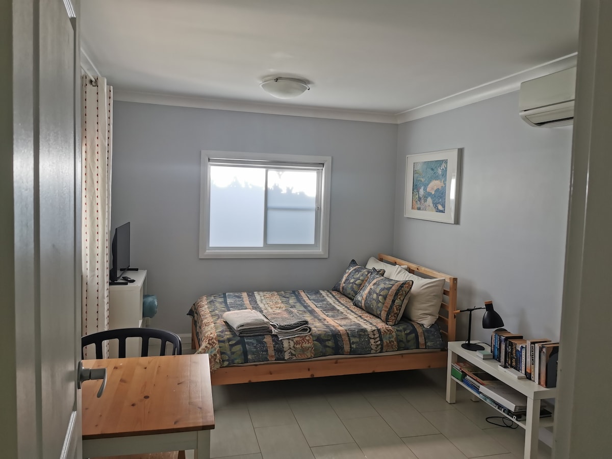Recently built, under our existing house with separate entry is Parthenia Studio with beer garden and outdoor, hot shower! Coffee pod machine, teas, milks and some basics are provided for a light breakfast and basic cooking. IGA, Vintage Cellars, Bakery, Takeaways and Cafés are all a 10minute walk away. The Westfields Miranda bus via Caringbah Train Station is at the door. A collection of prosecco, white, rosé and red wine is in your room and can be paid into the Trust Box.