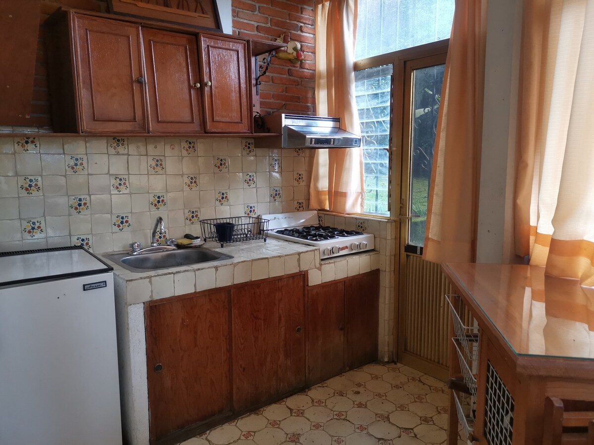 Ideal for romantic moments. A small house ideal for resting in a wooded area with 500 square meters of garden. Ideal for one person or a couple. Located within a subdivision with entrance from the federal highway, a 15-minute drive from Cuernavaca or an hour from Mexico City. Independent parking for two autos. Typical Mexican finish with red partition and fireplace; bedroom with double bed, kitchen and living room.