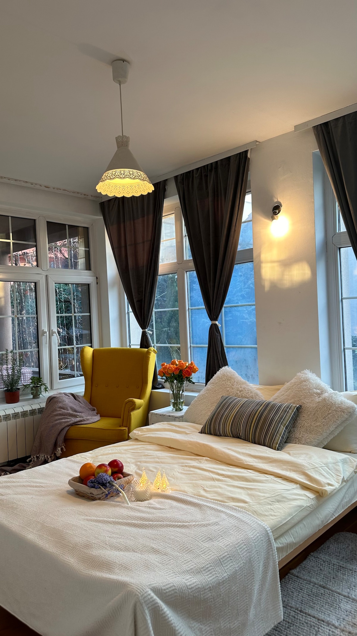 This beautiful open-space apartment with a garden view, located just 20min away from the city center, offers a quite bit of heaven where you can kick back and relax with your family and friends. The garden is a wonderful space for smaller gatherings (up to 15 people), BBQing in the sun, or just enjoying the relaxing breeze and sounds of the Zvezdara forest.