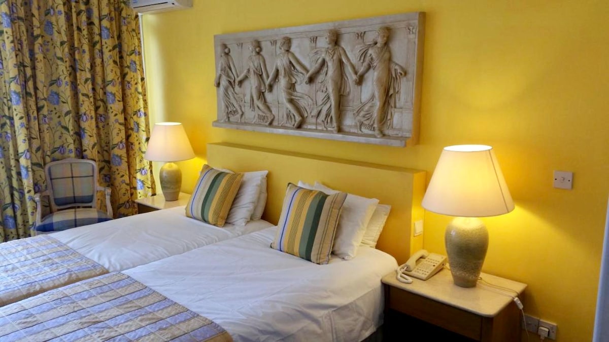 Boutique hotel room in Larnaca city center including free wifi, complimentary outstanding breakfast buffet, free access to the gym 24/7, free private parking, 24/7 reception desk and daily housekeeping. Additional services: airport shuttle, conference room, business center, lounge bar, room service and pool table. The hotel and room design are unique/themed and include artistic elements and wall painted celebrities and popular figures such as movie actors, athletes, singers and much more!!