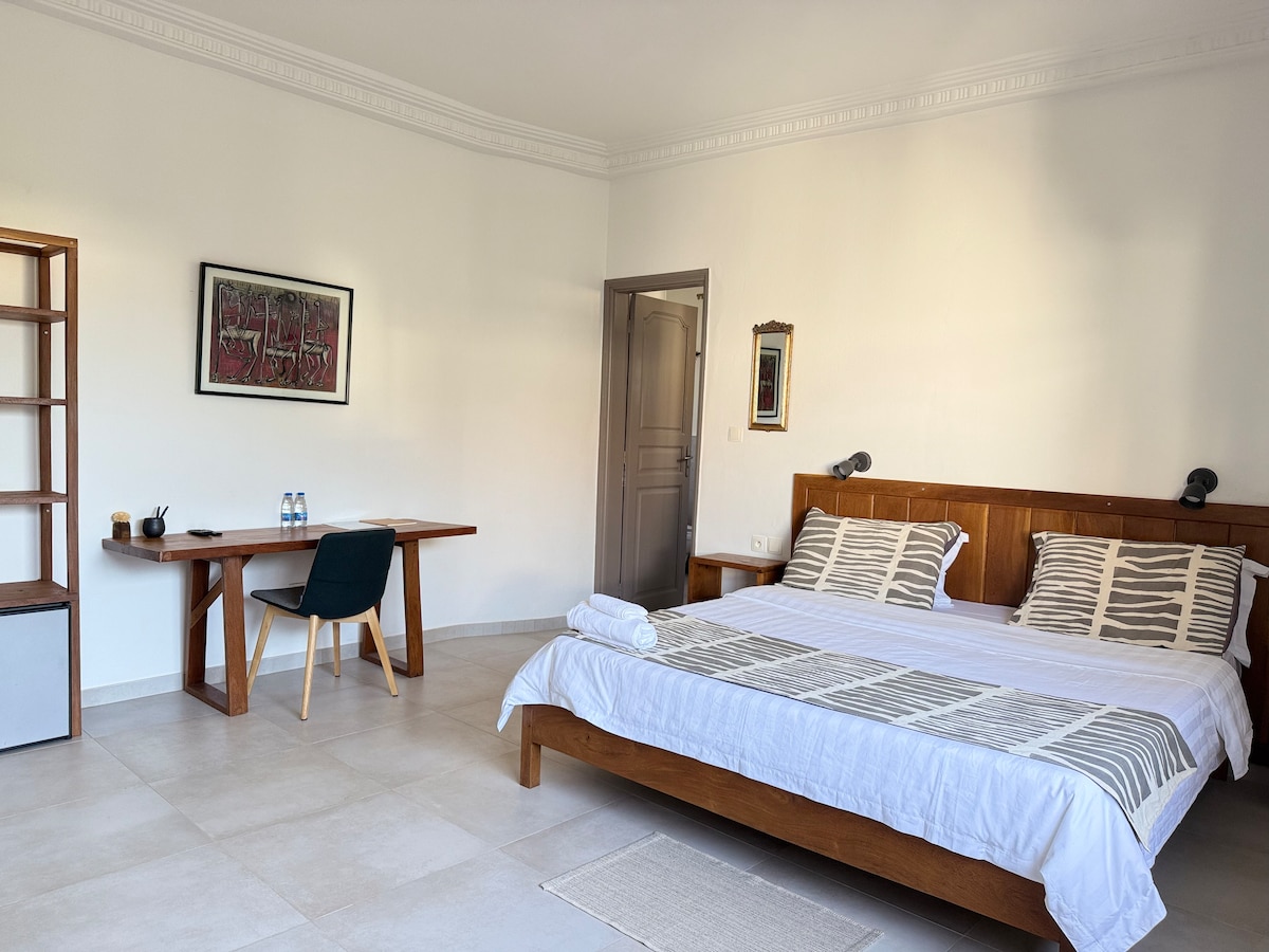 Experience Dakar in our seafront property. It is spacious and it offers free daily cleaning, AC in every room, and a 24/7 concierge for a seamless stay. This room is connected to a spacious private living room. Breakfast is available on demand Enjoy added convenience with optional services like tourist guides, and airport shuttles tailored to your needs.