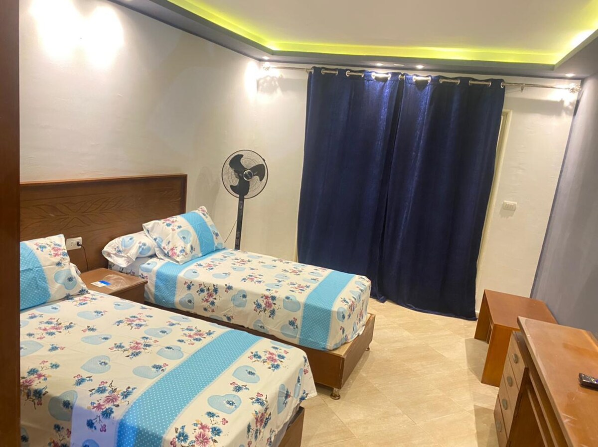 Hotel apartment in front of the sea in Bellevue Agami Village, private beach and swimming pools . It consists of 3 rooms and 2 bathrooms. There is 3 rooms with fans. Stairs are comfortable 3rd floor Available for families and couples with a marriage certificate