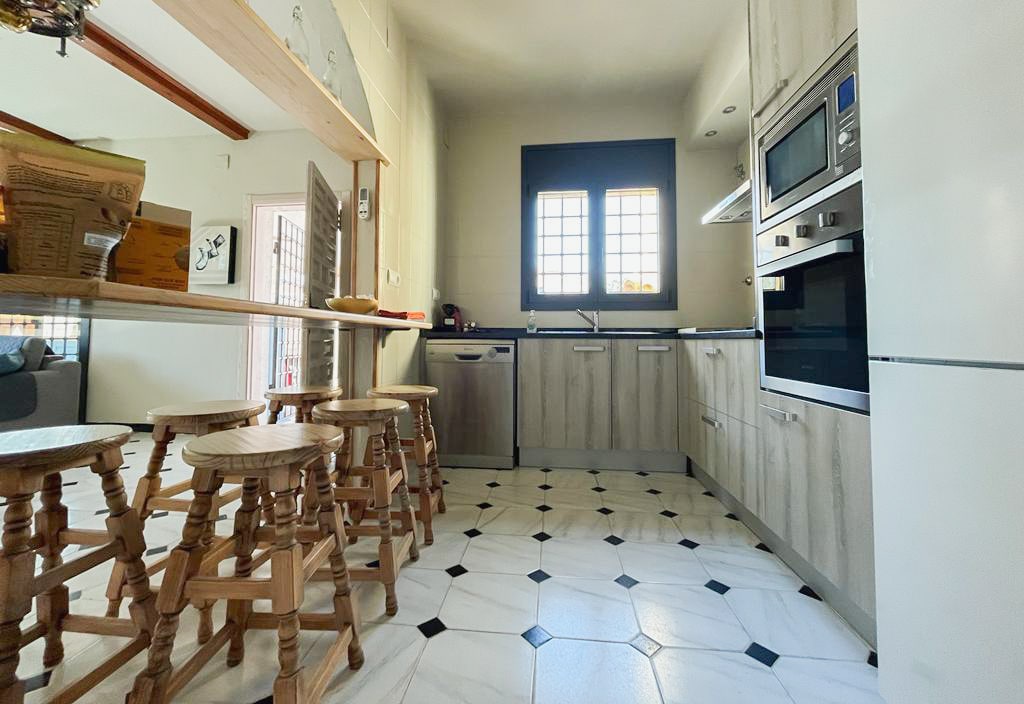 Detached villa with a great location, new furniture, three bedrooms, one double and the other double with closets. Living/dining room that connects with the kitchenette. Full bathroom with bathtub Large terrace with garden furniture and an upper terrace. Private pool with solarium, equipped with furniture and barbecue, all fenced, ideal for pets and children. Free Wi-Fi. No extras. Private parking outside or in the garage.