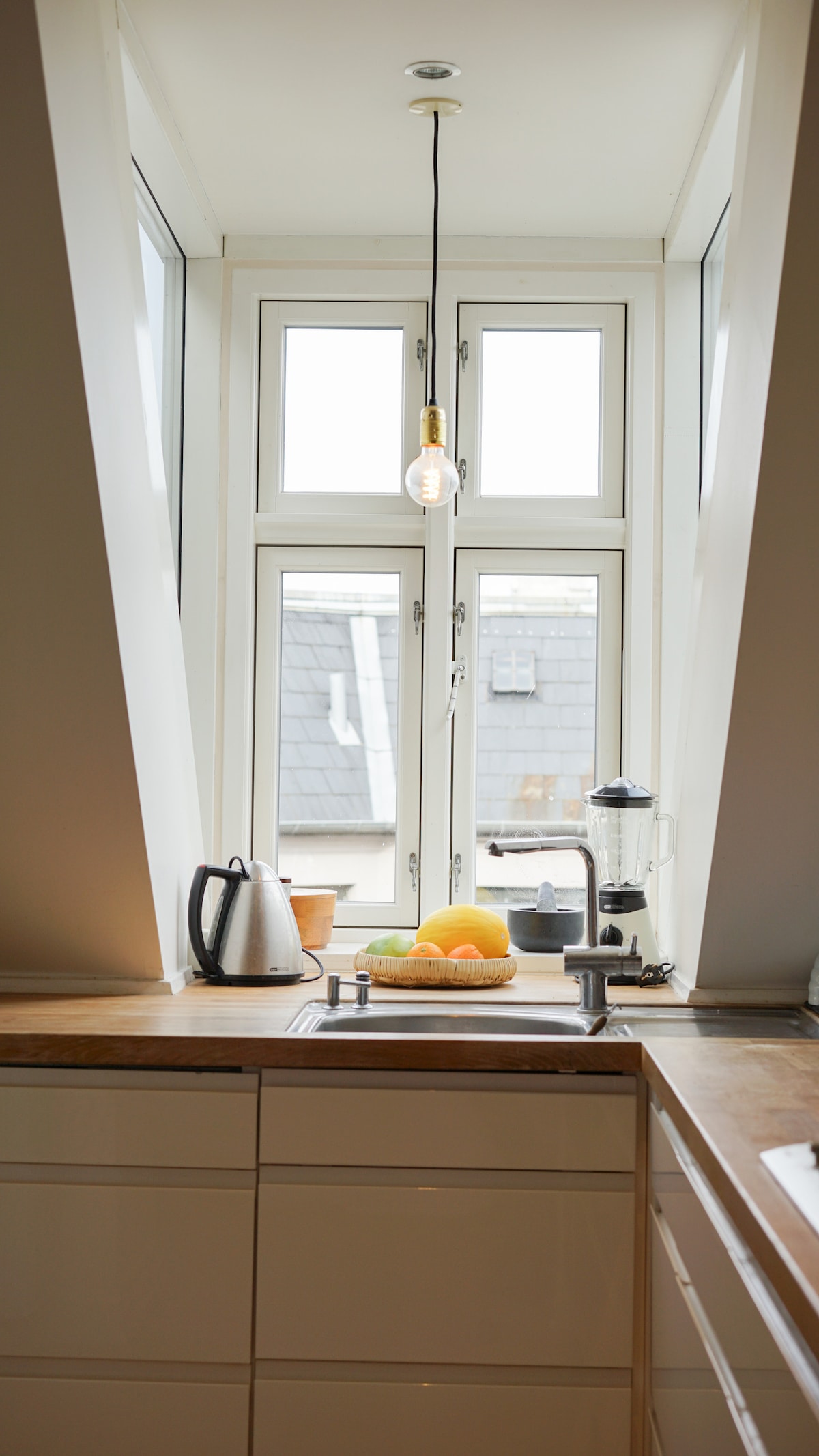 My apartment is situated on the third floor of a 300-year-old heritage building. It's important to note that, there is no elevator, which is common as less than 9 percent of buildings in Copenhagen's inner city have elevators. Keep this in mind if you have heavy luggage. My newly refurbished apartment features a hallway leading to the bathroom and a living room that opens to the sleeping area and kitchen. It offers a cozy (Hyggeligt) view of the city's rooftops.