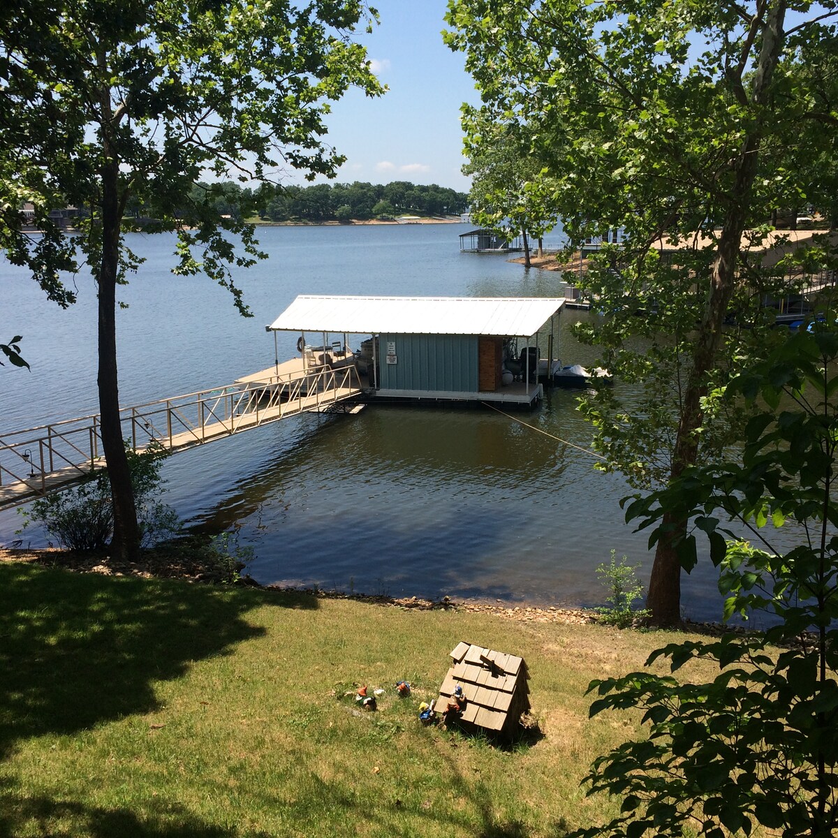This lodge-style cabin is tucked away on the calm waters of Fox Hollow, which is on the Drowning Creek Cove of South Grand Lake - just a short 1:20 drive from Tulsa. The cabin combines the best of old and new - nostalgic knotty-pine paneling and native stone fireplace combined with all leather and wood furnishings and premium pillow top beds. The covered boat dock has rooftop access and the private swim dock is perfect for launching a kayak into the cove.