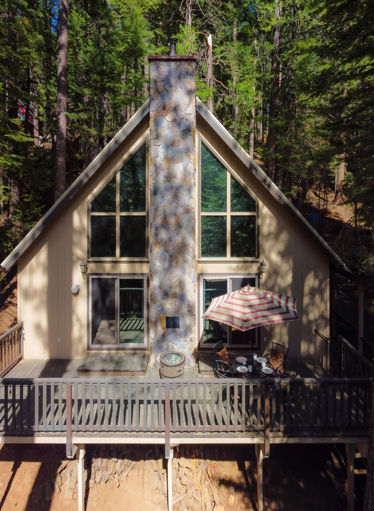 It is an A-frame cabin on stilts amongst the towering pines of the High Sierras of Northern California. At 5000 feet of elevation, it provides a perfect setting for an ultimate mountain getaway. The cabin has a rustic vibe, and is furnished with thoughtful details. It is remote, yet minutes from groceries, restaurants, the river, and one of the most treasured trees on the planet, the Sequoias.