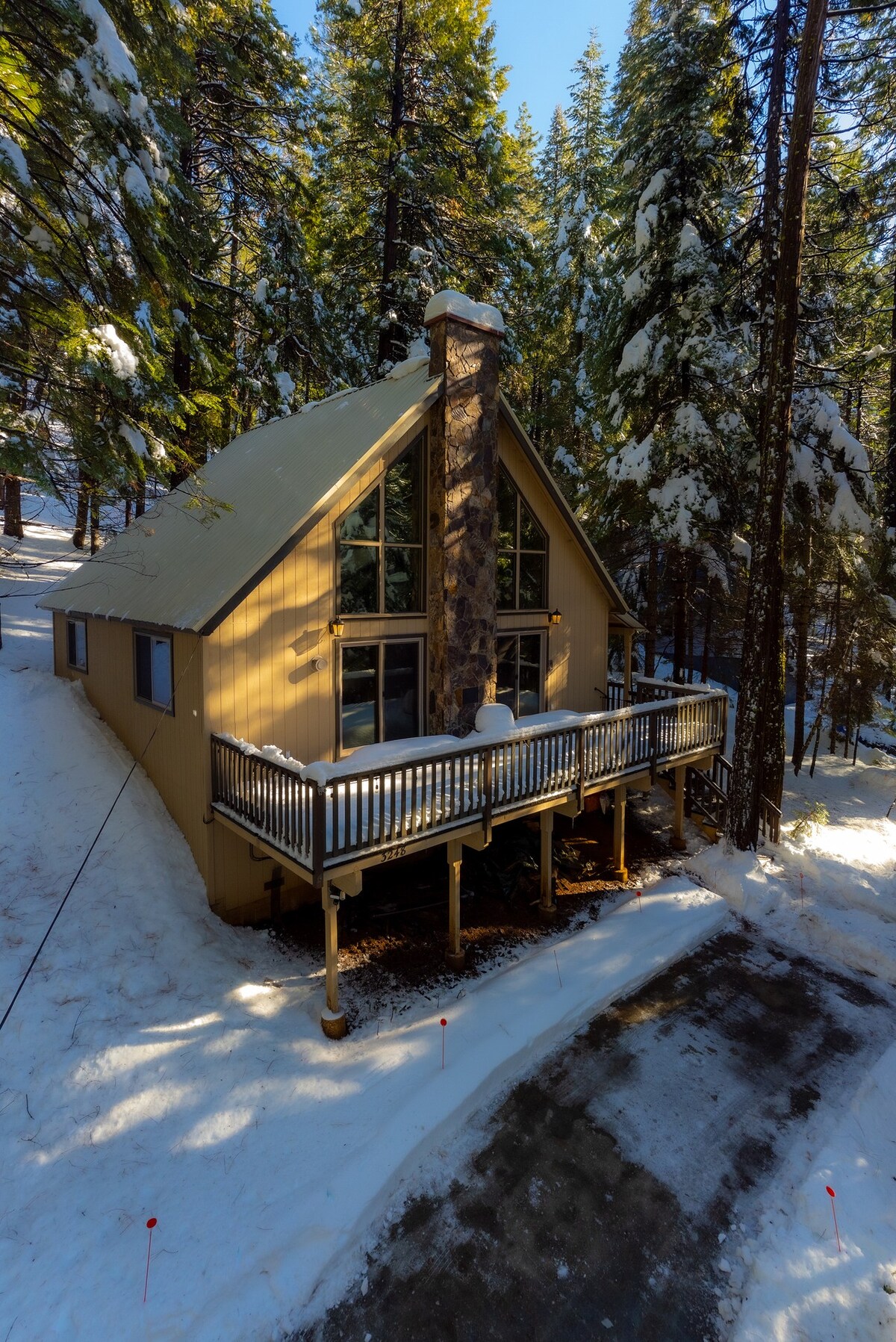 Welcome to Sierra Delight, your peaceful mountain retreat surrounded by towering sequoias. This spacious 2,200 sqft. cabin near Big Trees features modern comforts, top-to-bottom large windows with stunning forest and snowfall views, two game rooms, and a cozy living area with a 70” TV. Relax on the wraparound deck with BBQ, enjoy high-speed Wi-Fi, plush beds, and a full kitchen. Plus, Bear Valley just minutes away is now open for endless winter fun. Perfect for families & adventurers year-round.
