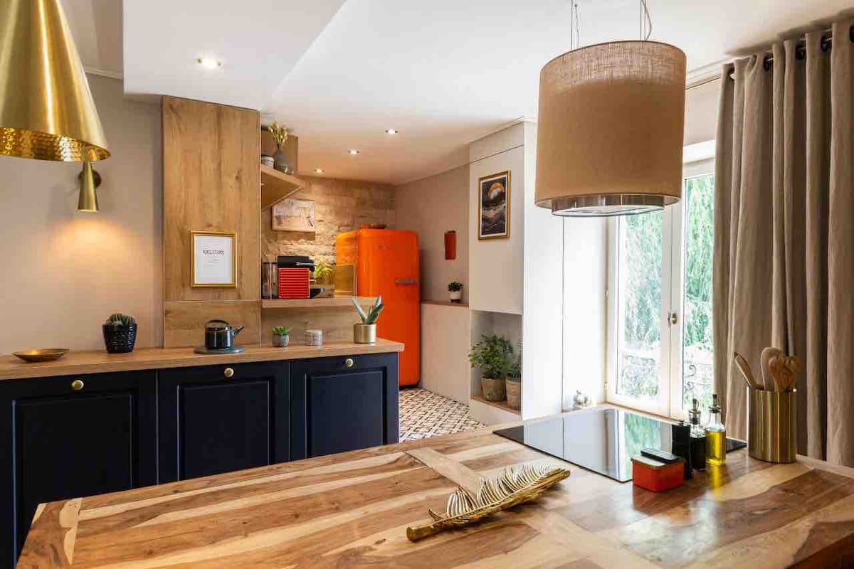 Baptisé "Un Autre Monde", this atypical place is installed in an old printing press, close to the city center. You have more than 250 m2 of fully equipped and personalized spaces with the unique furniture I create. There is also a game room and a chill-out area (by reservation and shared with the other apartments). A large garage allows you to park at least 3 cars and motorcycles. You will have a garden by the river accessible by a few steps.